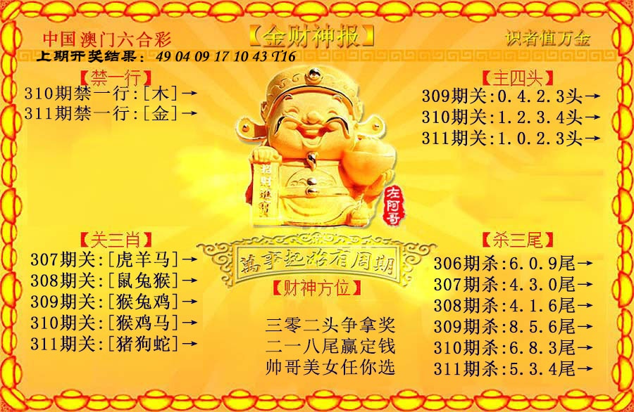 | 311期 | 〖兔猴狗马虎蛇〗实现梦想的强料 | 开:?00准 |