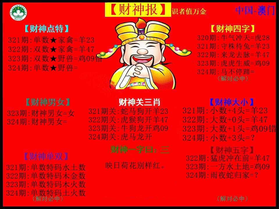 | 322期:半波特码【蓝单】开:羊47准 |